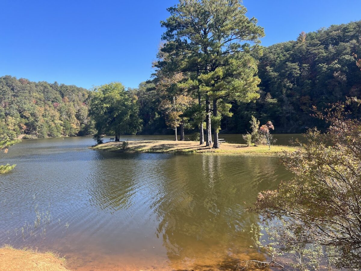 3 years agoThere is a trail that goes to the left of parking that is a short hike that ends on a little peninsula with a picnic table at the end. There is also an island that is accessible via boat that has seating and a nice secluded area. There are benches spaced nicely as you hike down.