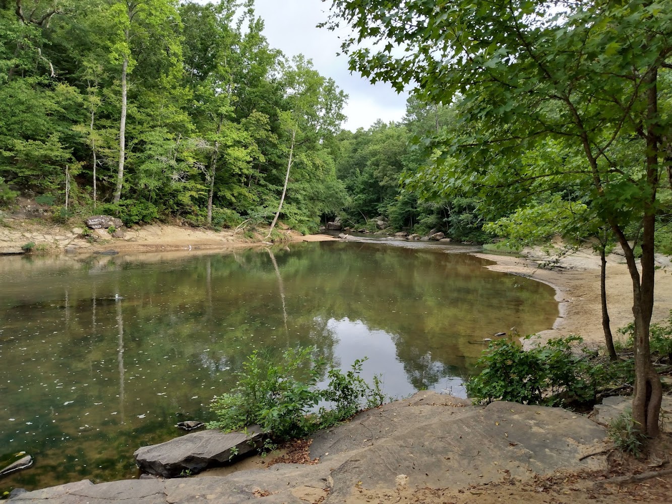 Lovely trails through some Alabama countryside. The initial walk in is pretty heavy with road noise and basically being in people's backyards. However about a mile in several trails split off and you have a nice quiet forest dominated by loblolly pines and some local Harwood. I particularly liked the broad leaf magnolias you can find scattered about. The Creek itself is not really accessible though there are a few nice overlook. Some rough paths down to the canyon the creek runs in do exist but we didn't stray from any designated trails. Those trails are pretty well kept lots of gravel on the main paths well packed earth on the side trails. The undergrowth is certainly open so if busy you will be seeing and hearing fellow hikers. Paths are dog friendly but bring them water it gets hot.